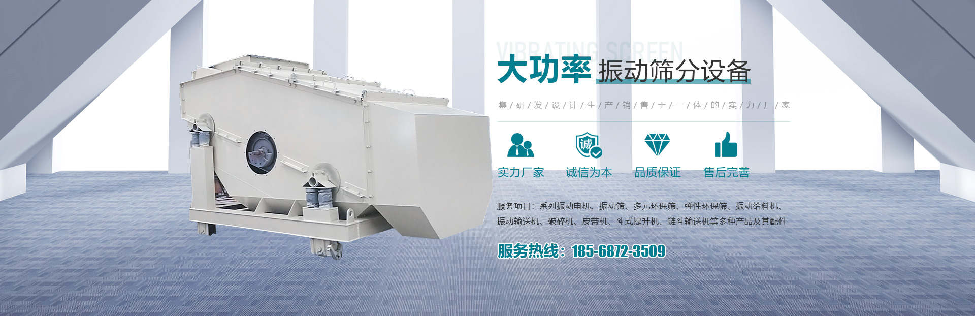 • 主要產(chǎn)品有系列振動(dòng)電機(jī)、振動(dòng)篩、多元環(huán)保篩、彈性環(huán)保篩、振動(dòng)給料機(jī)、振動(dòng)輸送機(jī)、破碎機(jī)、皮帶機(jī)、斗式提升機(jī)、鏈斗輸送機(jī)等多種產(chǎn)品